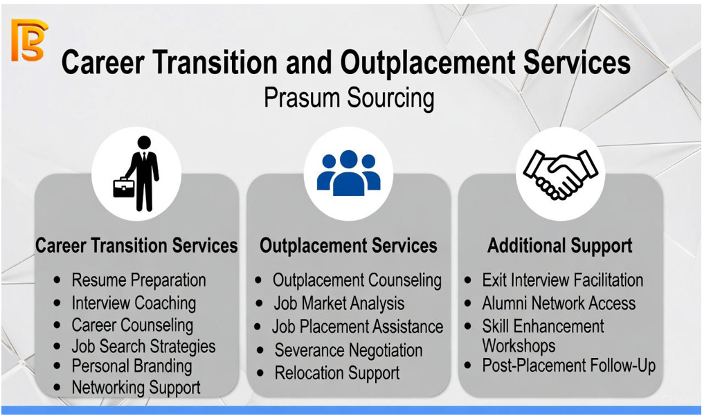 Prasum Sourcing partners with organizations to provide compassionate, professional support for employees navigating career transitions. Our services deliver emotional reassurance, expert career coaching, and active job-search assistance, helping individuals regain stability during a challenging period.